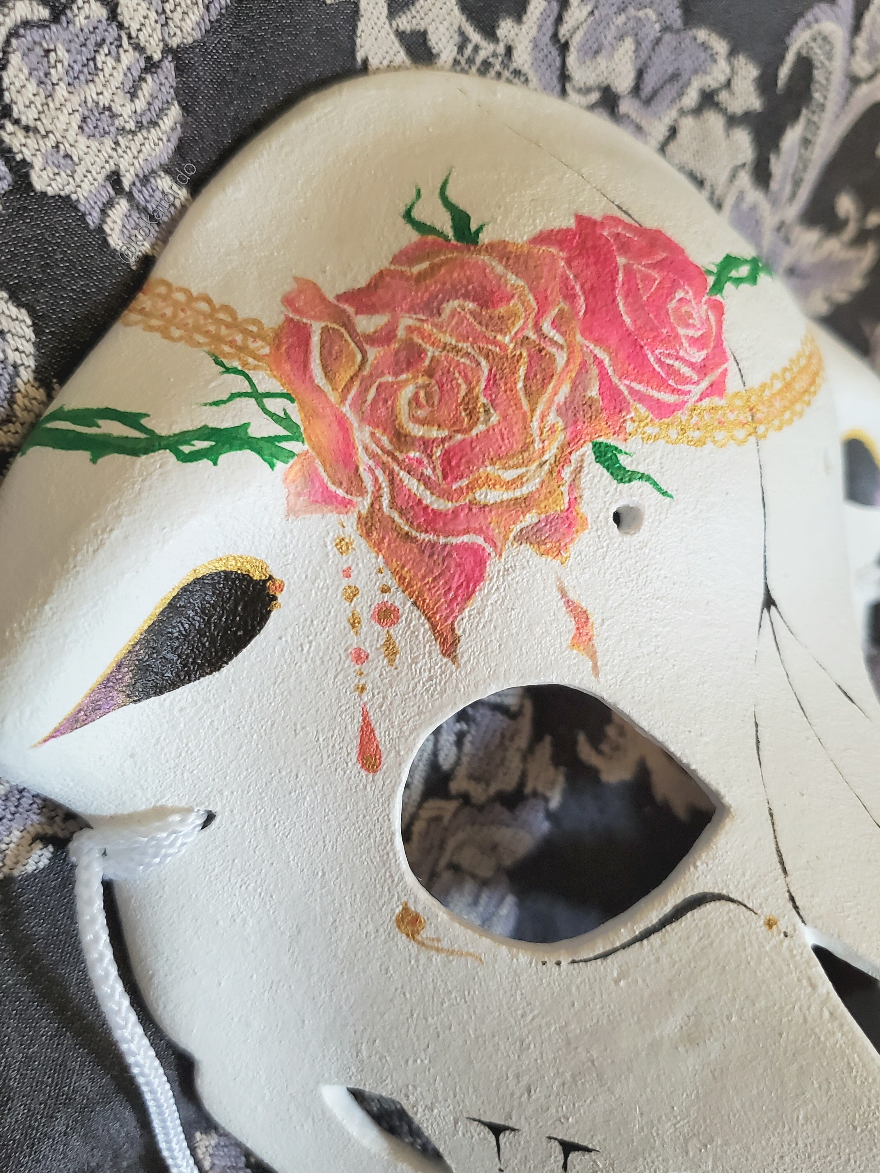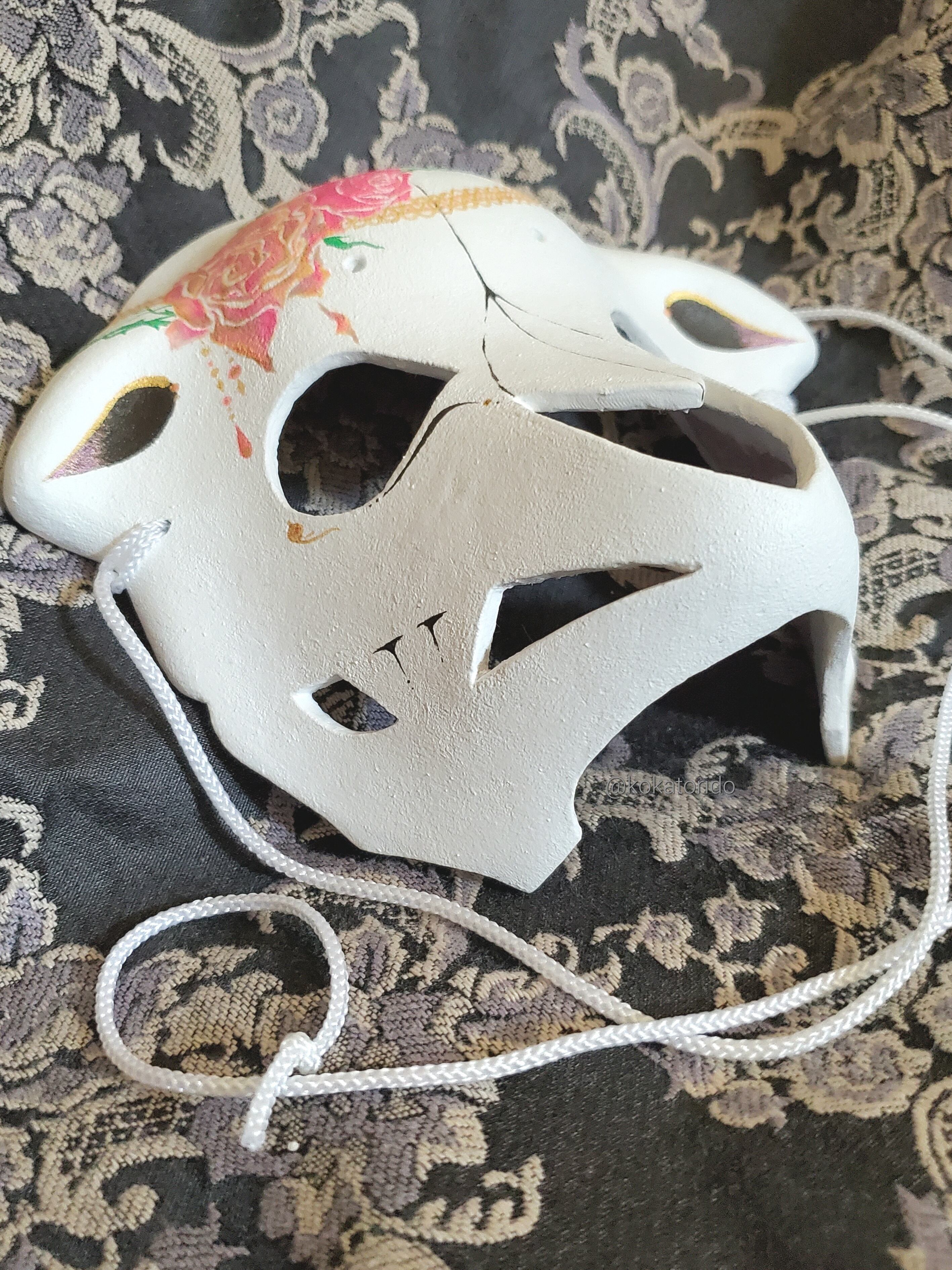 枯れゆくバロメッツをテーマにした羊面です。羊の骨格に薔薇とレースの冠を描いています。枯れかけて形が崩れたものと、まだ生気の残る薔薇の描き分けに拘ってみました。