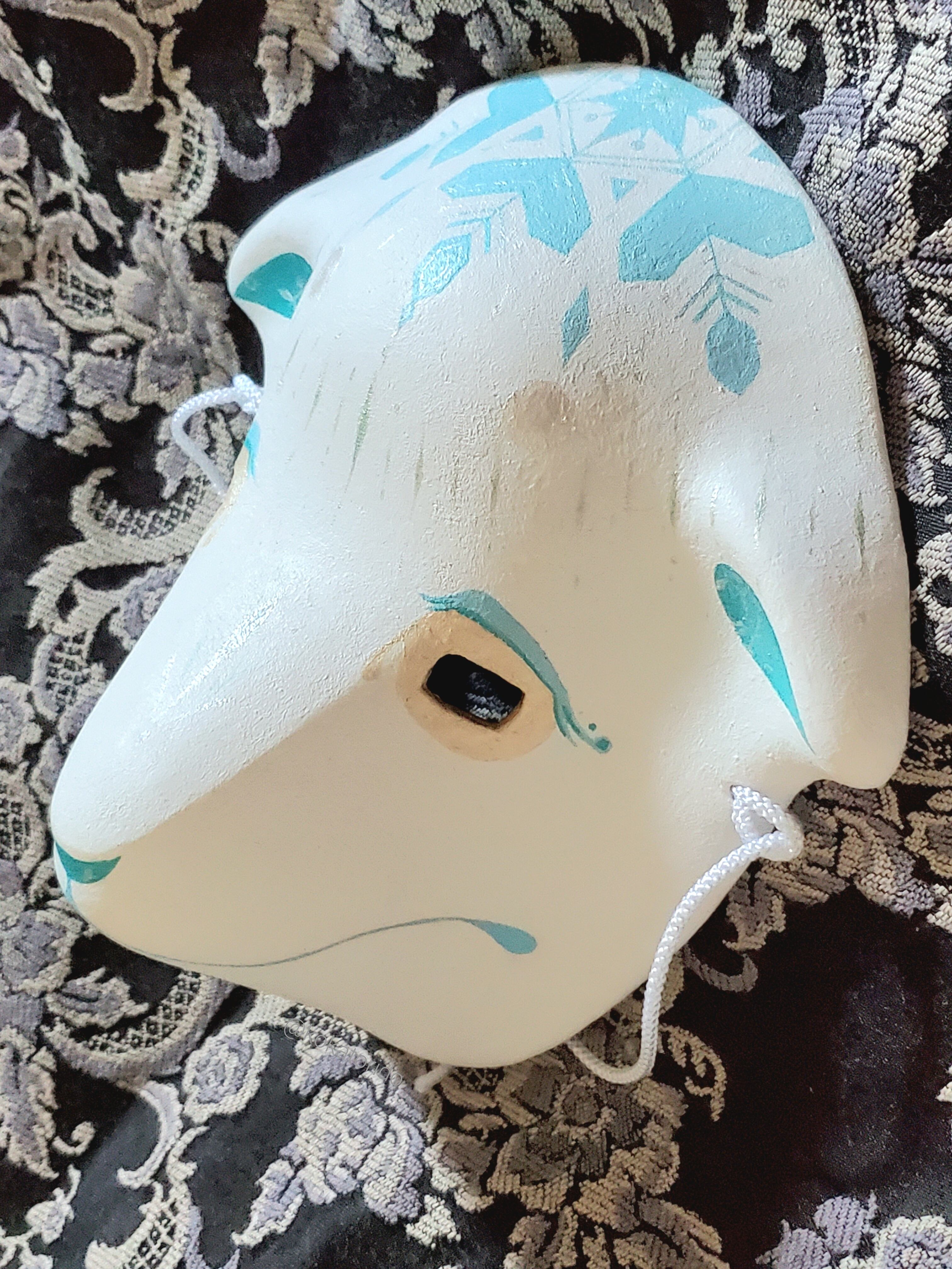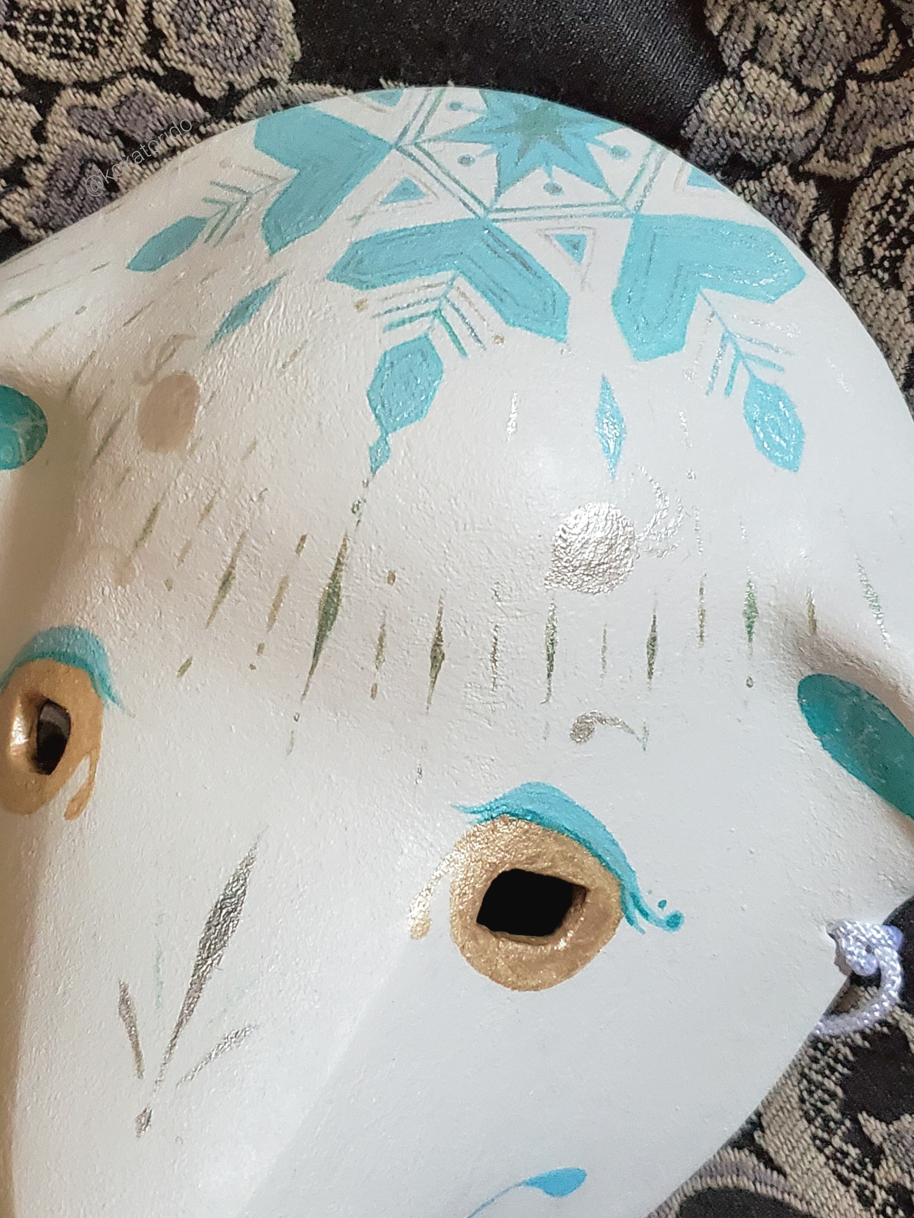 雪の結晶をヴェールや後光に見立てて描いた羊面です。